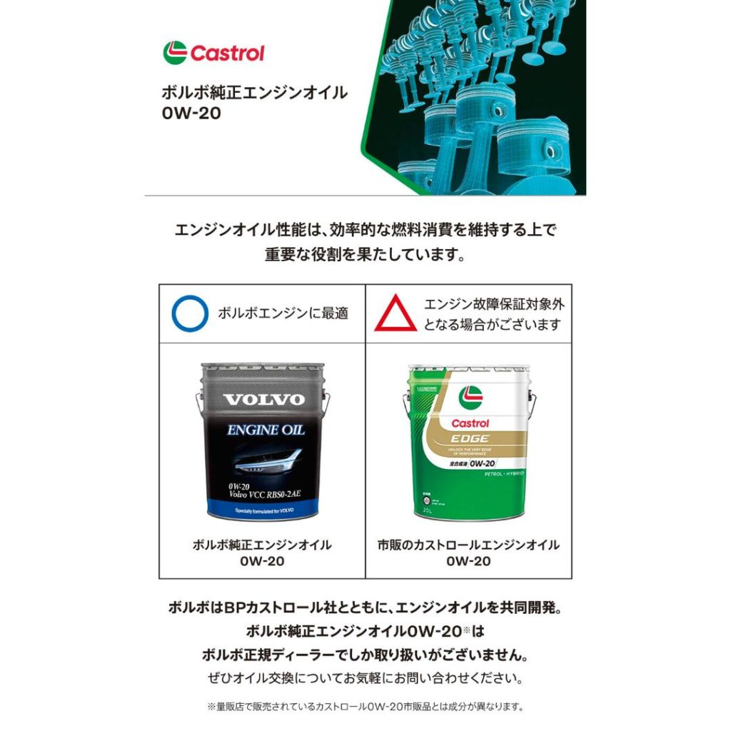 ボルボではCastrol社と共同開発したVOLVO専用0W-20というオイルを使用しております