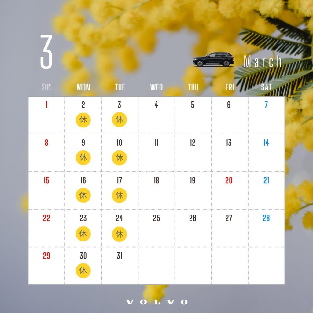 3月は… 2日(月)、3日(火) 9日(月)、10日(火) 16日(月)、17日(火) 23日(月)、24日(火) 30日(月) 以上9日間がお休みになります ※31日(火)は営業いたしますので、ご入庫のご予約をお待ちしております
